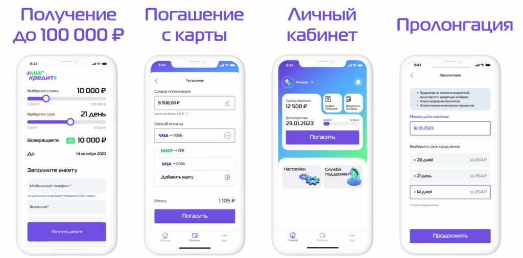 Мобильное приложение Кредит Миг предоставляет полный доступ к сервису. Пользователь может оформить займ МигКредит на карту мгновенно, получить деньги через СБП, внести платёж в счёт погашения задолженности или обратиться в поддержку. Все действия доступны без посещения офиса.