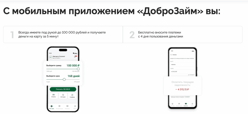Мобильное приложение ДоброЗайм предоставляет заемщикам полный набор функций для дистанционного управления микрозаймом. Сервис ориентирован на самостоятельное использование и позволяет выполнять основные операции без обращения в службу поддержки.
