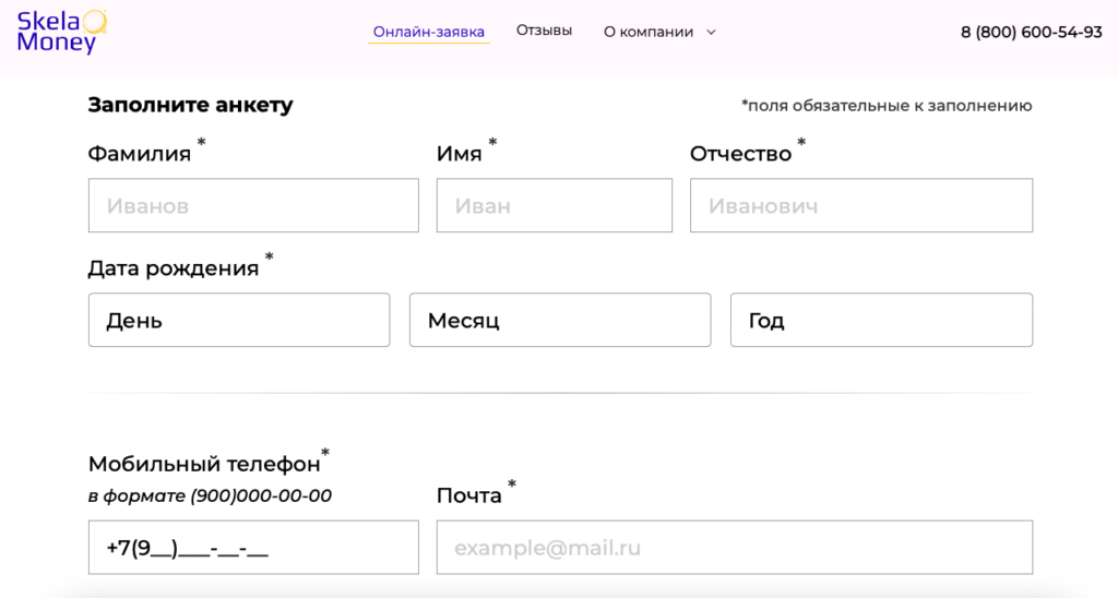 - Заполните онлайн-анкету: укажите ФИО, действующий номер телефона, паспортные данные, информацию о занятости и доходах.