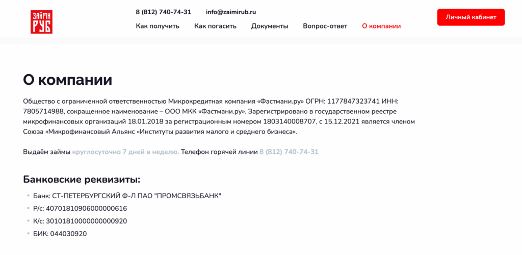 На официальном сайте ЗаймиРУБ предусмотрены информационные разделы, в которых размещаются актуальные контактные данные и юридическая информация о компании. Также на сайте доступен личный кабинет клиента, через который можно отслеживать статус займа и направлять запросы в службу поддержки в рамках обслуживания договора.